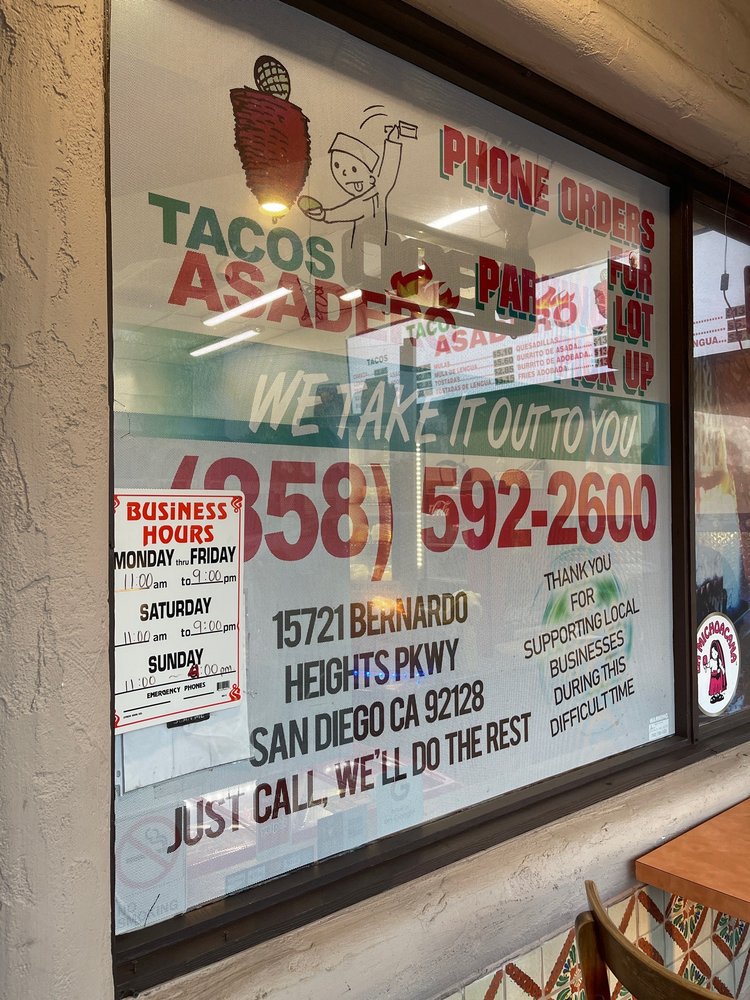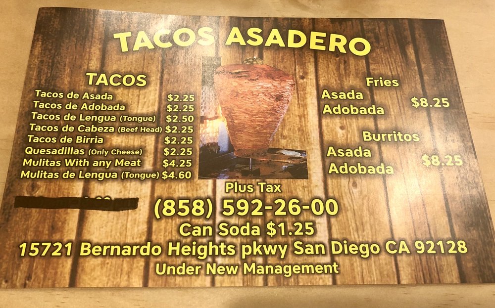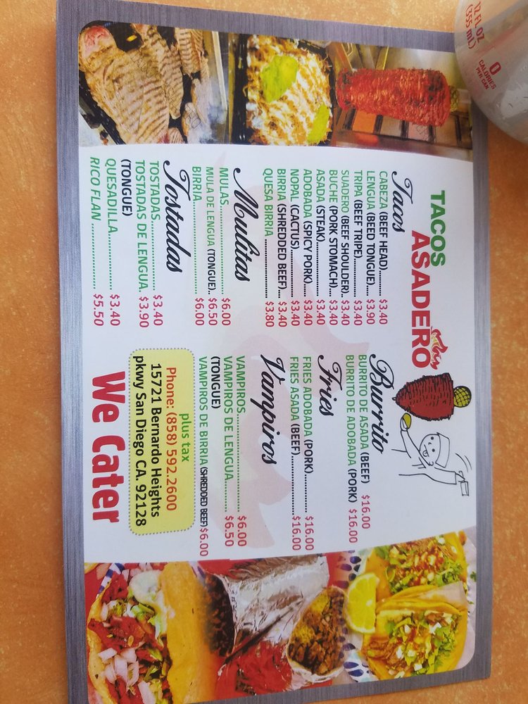 Tacos Asadero, a Mexican gem located in San Diego, offers an authentic dining experience with a variety of meat options such as pork, steak, tripe, and even beef or mule tongue. The menu boasts flavorful dishes like Adobada and Birria, paired with options like melted cheese and flour tortillas. Customers rave about the cozy ambiance and fast service, making it a go-to spot for affordable and delicious lunches. With options for outdoor seating and gender-neutral restrooms, Tacos Asadero caters to a diverse clientele. Don't miss out on their Gyro-style meat carved to order, adding a unique touch to traditional Mexican cuisine. Cash is preferred to avoid card fees, but the friendly staff and mouthwatering flavors make it worth a visit. Come for the tacos, stay for the authentic vibe at Tacos Asadero.